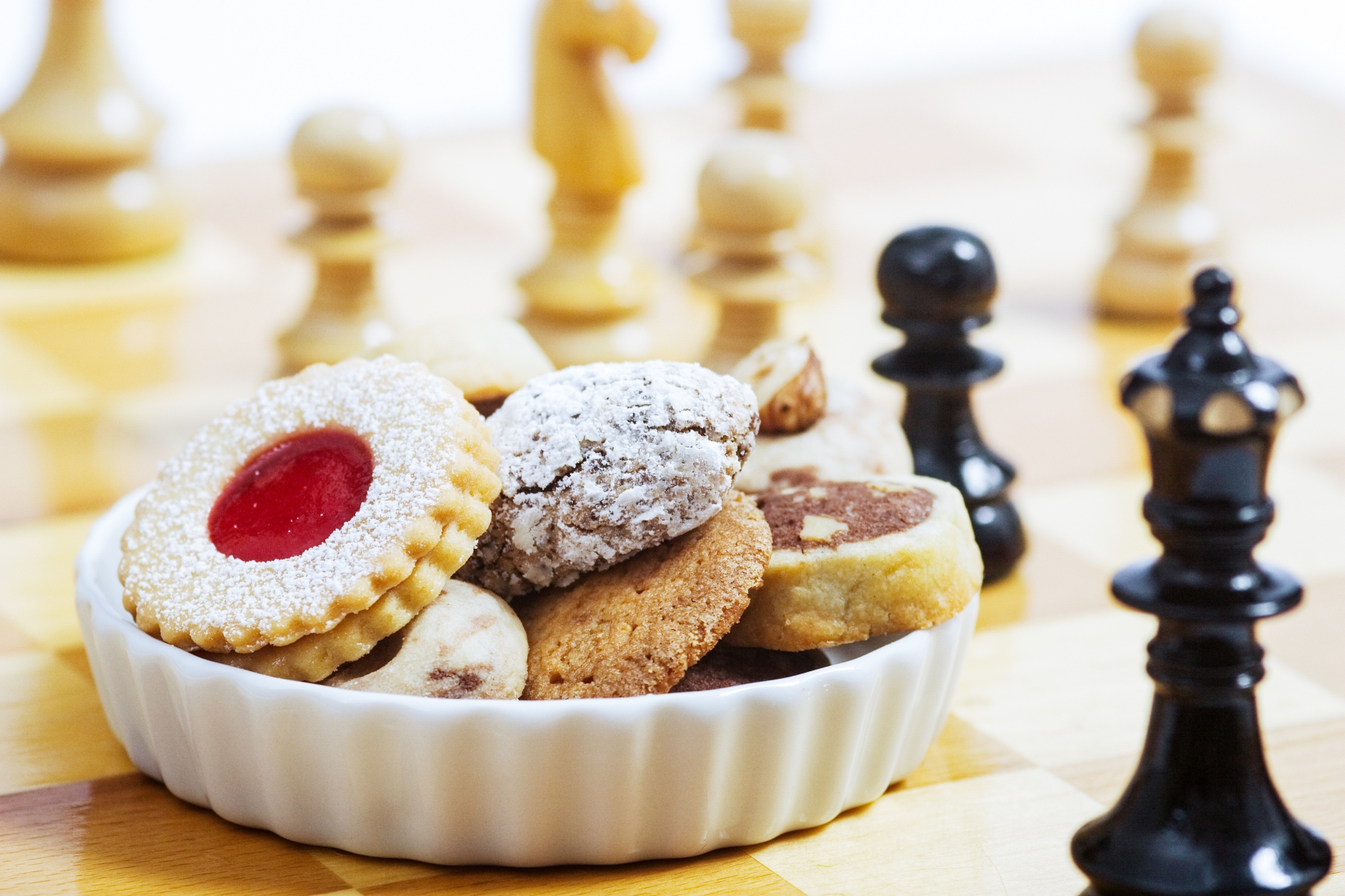 Kleine Schale mit gemischten Keksen auf einem Schachbrett
